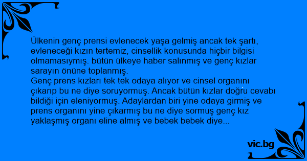 Prens karısına"bak karıcım biz evlendik artık bazı şeyleri öğrenmen lazım o sevdiğin bebek değil benin cinsel organım ilişkiye girmeye yarar." bunun üzerine prenses"ah kocacığım ben bu güne dek nelerini gördüm seninki daha bebeek bebeek"