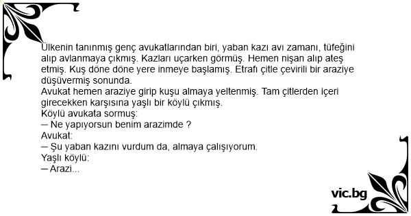 Avukat hemen araziye girip kuşu almaya yeltenmiş. Tam çitlerden içeri girecekken karşısına yaşlı bir köylü çıkmış.
