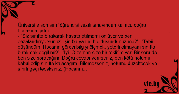 - “Siz sınıfta bırakarak hayata atılmamı önlüyor ve beni cezalandırıyorsunuz. İşin bu yanını hiç düşündünüz mü?” -“Tabii düşündüm. Hocanın görevi bilgiyi ölçmek, yeterli olmayanı sınıfta bırakmak değil mi?” -“İyi. O zaman size bir teklifim var. Bir soru da ben size soracağım. Doğru cevabı verirseniz, ben kötü notumu kabul edip sınıfta kalacağım. Bilemezseniz, notumu düzeltecek ve sınıfı geçirteceksiniz. (Hocanın keyfi yerinde. Teklifi kabul eder.) Ve öğrenci sorar: