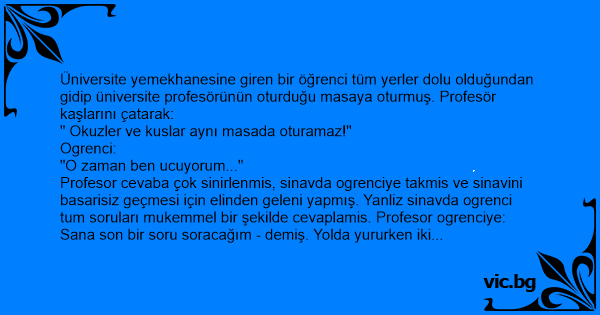 Üniversite yemekhanesine giren bir öğrenci tüm yerler dolu olduğundan gidip üniversite profesörünün oturduğu masaya oturmuş. Profesör kaşlarını çatarak: