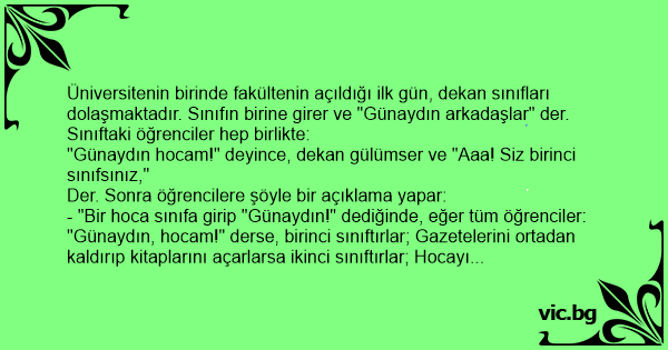 Üniversitenin birinde fakültenin açıldığı ilk gün, dekan sınıfları dolaşmaktadır. Sınıfın birine girer ve "Günaydın arkadaşlar" der.
