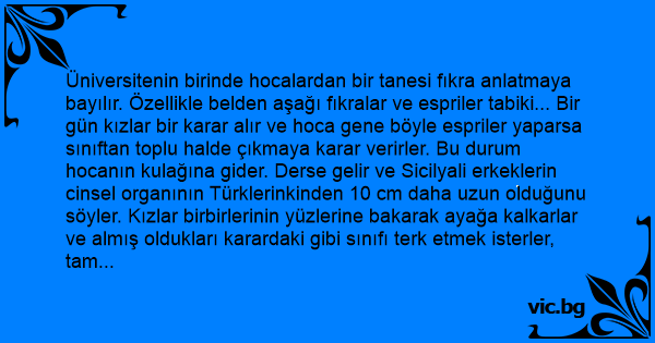 Üniversitenin birinde hocalardan bir tanesi fıkra anlatmaya bayılır. Özellikle belden aşağı fıkralar ve espriler tabiki... Bir gün kızlar bir karar alır ve hoca gene böyle espriler yaparsa sınıftan toplu halde çıkmaya karar verirler. Bu durum hocanın kulağına gider. Derse gelir ve Sicilyali erkeklerin cinsel organının Türklerinkinden 10 cm daha uzun olduğunu söyler. Kızlar birbirlerinin yüzlerine bakarak ayağa kalkarlar ve almış oldukları karardaki gibi sınıfı terk etmek isterler, tam sınıftan toplu halde çıkarken, hoca kızlara seslenir: