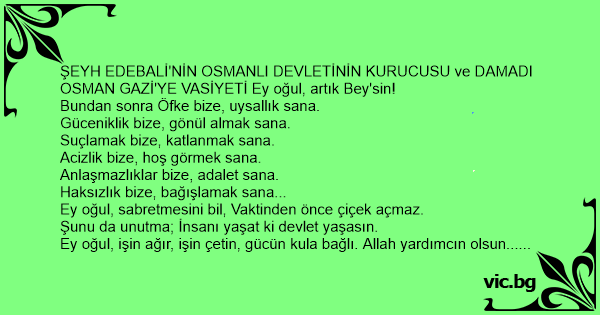 ŞEYH EDEBALİ'NİN OSMANLI DEVLETİNİN KURUCUSU ve DAMADI OSMAN GAZİ'YE VASİYETİ Ey oğul, artık Bey'sin!