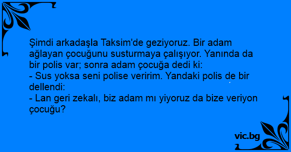 Şimdi arkadaşla Taksim'de geziyoruz. Bir adam ağlayan çocuğunu susturmaya çalışıyor. Yanında da bir polis var; sonra adam çocuğa dedi ki: