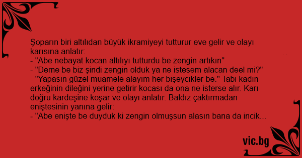 Şoparın biri altılıdan büyük ikramiyeyi tutturur eve gelir ve olayı karısına anlatır: