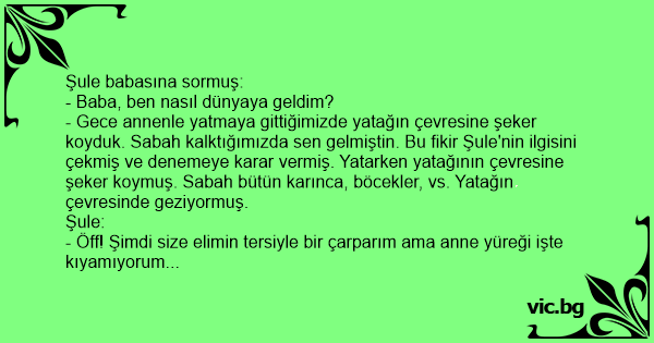 - Gece annenle yatmaya gittiğimizde yatağın çevresine şeker koyduk. Sabah kalktığımızda sen gelmiştin. Bu fikir Şule'nin ilgisini çekmiş ve denemeye karar vermiş. Yatarken yatağının çevresine şeker koymuş. Sabah bütün karınca, böcekler, vs. Yatağın çevresinde geziyormuş.