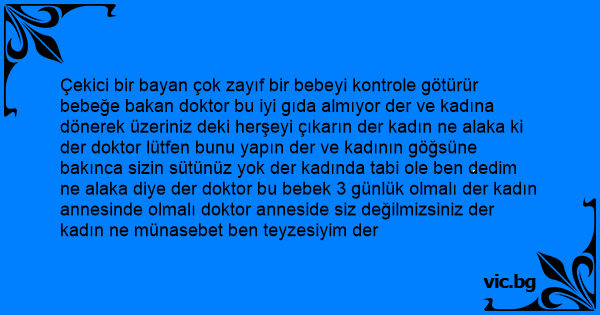 Çekici bir bayan çok zayıf bir bebeyi kontrole götürür bebeğe bakan doktor bu iyi gıda almıyor der ve kadına dönerek üzeriniz deki herşeyi çıkarın der kadın ne alaka ki der doktor lütfen bunu yapın der ve kadının göğsüne bakınca sizin sütünüz yok der kadında tabi ole ben dedim ne alaka diye der doktor bu bebek 3 günlük olmalı der kadın annesinde olmalı doktor anneside siz değilmizsiniz der kadın ne münasebet ben teyzesiyim der