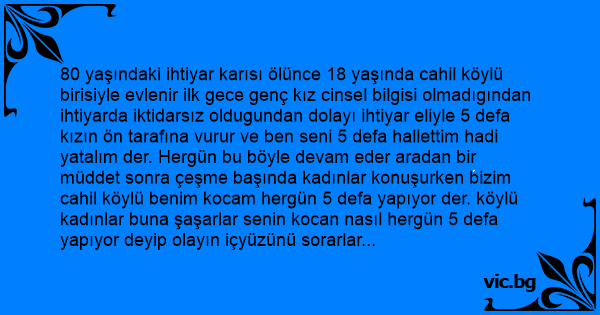 80 yaşındaki ihtiyar karısı ölünce 18 yaşında cahil köylü birisiyle evlenir ilk gece genç kız cinsel bilgisi olmadıgından ihtiyarda iktidarsız oldugundan dolayı ihtiyar eliyle 5 defa kızın ön tarafına vurur ve ben seni 5 defa hallettim hadi yatalım der. Hergün bu böyle devam eder aradan bir müddet sonra çeşme başında kadınlar konuşurken bizim cahil köylü benim kocam hergün 5 defa yapıyor der. köylü kadınlar buna şaşarlar senin kocan nasıl hergün 5 defa yapıyor deyip olayın içyüzünü sorarlar cahil köylü ihtiyarın nasıl yaptıgını anlatır. köylü kadınlar o işin nasıl yapıldıgını cahil köylüye anlatırlar. Akşam olup bizim ihtiyar ile cahil köylü yataga girince bizim ihtiyar hergün yaptıgı gibi elini kızın önüne götürüp 1 deyince kız dur der. komşununki gibi olsun bir defa olsun der.