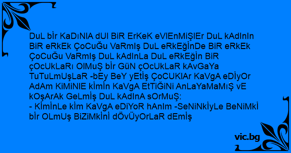 DuL bİr KaDıNlA dUl BiR ErKeK eVlEnMiŞlEr DuL kAdInIn BiR eRkEk ÇoCuĞu VaRmIş DuL eRkEğİnDe BiR eRkEk ÇoCuĞu VaRmIş DuL kAdInLa DuL eRkEğİn BiR çOcUkLaRı OlMuŞ bİr GüN çOcUkLaR kAvGaYa TuTuLmUşLaR -bEy BeY yEtİş ÇoCUKlAr KaVgA eDİyOr AdAm KiMiNlE kİmİn KaVgA EtTiĞiNi AnLaYaMaMıŞ vE kOşArAk GeLmİş DuL kAdInA sOrMuŞ: