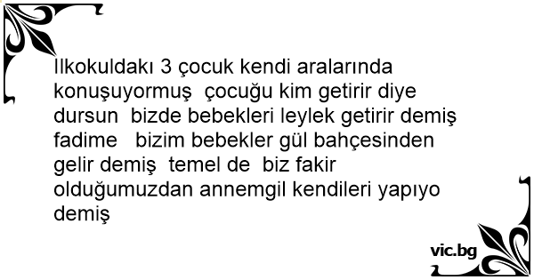 Ilkokuldakı 3 çocuk kendi aralarında konuşuyormuş çocuğu kim getirir diye dursun bizde bebekleri leylek getirir demiş fadime bizim bebekler gül bahçesinden gelir demiş temel de biz fakir olduğumuzdan annemgil kendileri yapıyo demiş
