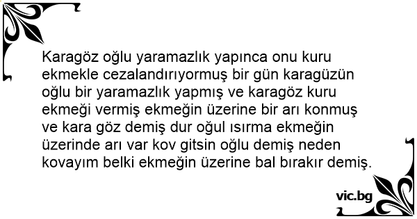 Karagöz oğlu yaramazlık yapınca onu kuru ekmekle cezalandırıyormuş bir gün karagüzün oğlu bir yaramazlık yapmış ve karagöz kuru ekmeği vermiş ekmeğin üzerine bir arı konmuş ve kara göz demiş dur oğul ısırma ekmeğin üzerinde arı var kov gitsin oğlu demiş neden kovayım belki ekmeğin üzerine bal bırakır demiş.