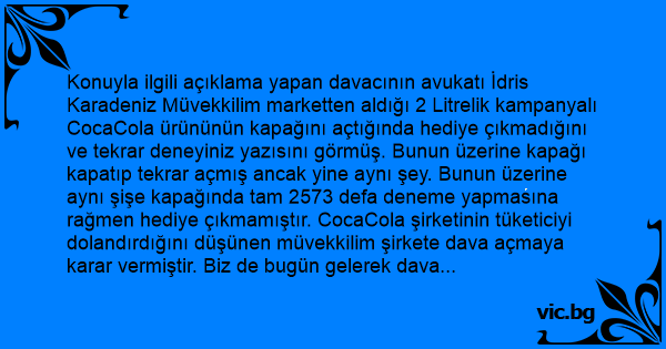 Konuyla ilgili açıklama yapan davacının avukatı İdris Karadeniz Müvekkilim marketten aldığı 2 Litrelik kampanyalı CocaCola ürününün kapağını açtığında hediye çıkmadığını ve tekrar deneyiniz yazısını görmüş. Bunun üzerine kapağı kapatıp tekrar açmış ancak yine aynı şey. Bunun üzerine aynı şişe kapağında tam 2573 defa deneme yapmasına rağmen hediye çıkmamıştır. CocaCola şirketinin tüketiciyi dolandırdığını düşünen müvekkilim şirkete dava açmaya karar vermiştir. Biz de bugün gelerek dava dilekçemizi adliyeye teslim ettik. 10 bin TL Maddi tazminat talep etmekteyiz, dedi. Davadan haberdar olan CocaCola yönetimi adına açıklama yapan bir şirket yetkilisi olayın çok komik olduğunu ve artık Karadeniz bölgesine gönderilen ürünlerin kapağına;