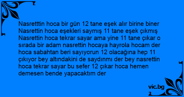Nasretttin hoca bir gün 12 tane eşek alır birine biner Nasrettin hoca eşekleri saymış 11 tane eşek çıkmış Nasrettin hoca tekrar sayar ama yine 11 tane çıkar o sırada bir adam nasrettin hocaya hayrola hocam der hoca sabahtan beri sayıyorun 12 olacağına hep 11 çıkıyor bey altındakini de saydınmı der bey nasrettin hoca tekrar sayar bu sefer 12 çıkar hoca hemen demesen bende yapacaktım der