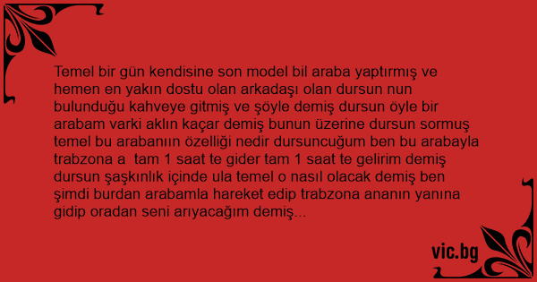 Temel bir gün kendisine son model bil araba yaptırmış ve hemen en yakın dostu olan arkadaşı olan dursun nun bulunduğu kahveye gitmiş ve şöyle demiş dursun öyle bir arabam varki aklın kaçar demiş bunun üzerine dursun sormuş temel bu arabanıın özelliği nedir dursuncuğum ben bu arabayla trabzona a tam 1 saat te gider tam 1 saat te gelirim demiş dursun şaşkınlık içinde ula temel o nasıl olacak demiş ben şimdi burdan arabamla hareket edip trabzona ananın yanına gidip oradan seni arıyacağım demiş saatlerini ayarlamışlar ve temel yola çıkmış tam 1 saat sonra kahvehanenin telefonu çalmış ve telefonun diğer ucundaki kişi dursunu istemiş dursun şimdi sen anneni ara demiş bunun üzerine dursun anasını arar ve temeli ister temele şöyle der ula 1 saate gittin haydi şimdide 1 saate dön gel iddanın parasını kazan temel tamam der ve yola çıkar ve 1 saat geçer temel yok 2 saat yok 3 saat yok 1 hafta sonra temel döner herkes ve dursun hayretler içinde temele hemen sorarlar ula temel giderken 1 saat te gittinde gelirken neden 1 haftada geldin temel şöyle cevap vermiş ula uşaklar elin gavuru bu arabaya ileri 5 vites koymuş geri vitesi 1 tane koymuşlar.
