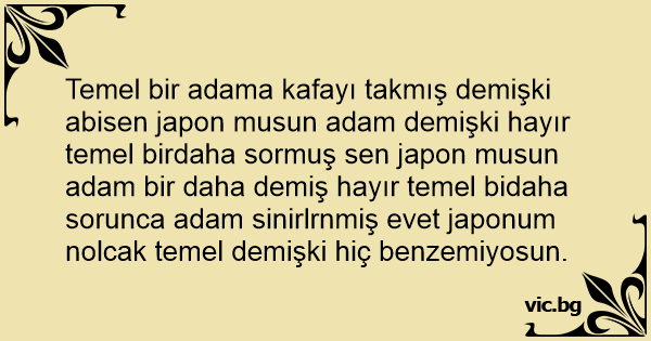 Temel bir adama kafayı takmış demişki abisen japon musun adam demişki hayır temel birdaha sormuş sen japon musun adam bir daha demiş hayır temel bidaha sorunca adam sinirlrnmiş evet japonum nolcak temel demişki hiç benzemiyosun.