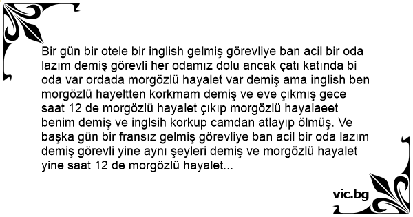 Bir gün bir otele bir inglish gelmiş görevliye ban acil bir oda lazım demiş görevli her odamız dolu ancak çatı katında bi oda var ordada morgözlü hayalet var demiş ama inglish ben morgözlü hayeltten korkmam demiş ve eve çıkmış gece saat 12 de morgözlü hayalet çıkıp morgözlü hayalaeet benim demiş ve inglsih korkup camdan atlayıp ölmüş. Ve başka gün bir fransız gelmiş görevliye ban acil bir oda lazım demiş görevli yine aynı şeyleri demiş ve morgözlü hayalet yine saat 12 de morgözlü hayalet benim diye çıkmış ve Fransız da korkup camdan atlayıp geberip gitmiş ve o günden sorna bir Türk Laz gelmiş ve bir oda istemiş görevli her odamız dolu ancak çatı katında bir oda var ordada morgözlü hayalet var demiş laz ben morgözlü hayaletten korkmam demiş ve saat 12 de morgözlü hayalet çıkmış morgözlü hayalet benim demiş ve türklaz da ikinci gözünüde ben morartırım demiş.