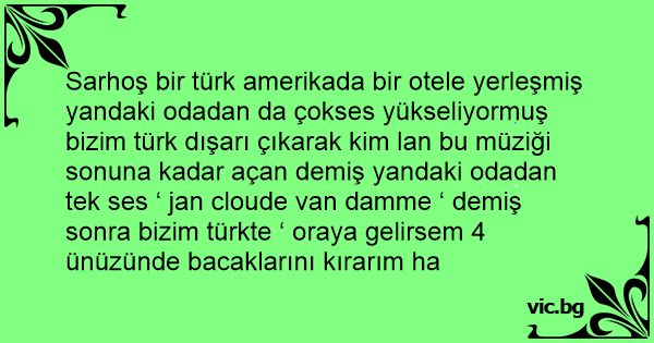 Sarhoş bir türk amerikada bir otele yerleşmiş yandaki odadan da çokses yükseliyormuş bizim türk dışarı çıkarak kim lan bu müziği sonuna kadar açan demiş yandaki odadan tek ses ‘ jan cloude van damme ‘ demiş sonra bizim türkte ‘ oraya gelirsem 4 ünüzünde bacaklarını kırarım ha