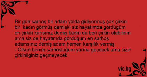 Bir gün sarhoş bir adam yolda gidiyormuş çok çirkin bir kadın görmüş demişki siz hayatımda gördüğüm en çirkin karısınız demiş kadın da ben çirkin olabilirim ama siz de hayatımda gördüğüm en sarhoş adamsınız demiş adam hemen karşılık vermiş.