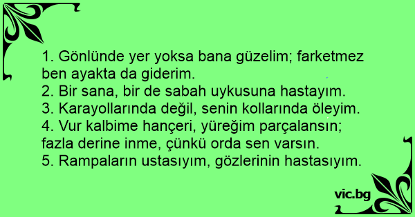 1. Gönlünde yer yoksa bana güzelim; farketmez ben ayakta da giderim.