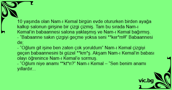- “Oğlum giт işine ben zaten çok yoruldum” Nam-ı Kemal çizgiyi geçen babaannesini bi güzel **km*ş. Akşam Nam-ı Kemal’in babası olayı öğrenince Nam-ı Kemal’e sormuş.