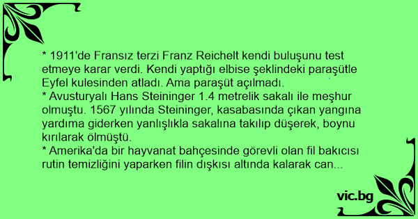 * 1911'de Fransız terzi Franz Reichelt kendi buluşunu test etmeye karar verdi. Kendi yaptığı elbise şeklindeki paraşütle Eyfel kulesinden atladı. Ama paraşüt açılmadı.