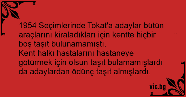 1954 Seçimlerinde Tokat'a adaylar bütün araçlarını kiraladıkları için kentte hiçbir boş taşıt bulunamamıştı.