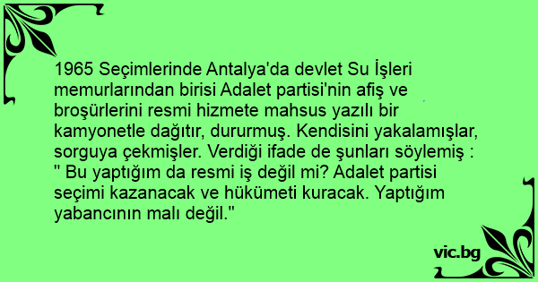 1965 Seçimlerinde Antalya'da devlet Su İşleri memurlarından birisi Adalet partisi'nin afiş ve broşürlerini resmi hizmete mahsus yazılı bir kamyonetle dağıtır, dururmuş. Kendisini yakalamışlar, sorguya çekmişler. Verdiği ifade de şunları söylemiş :