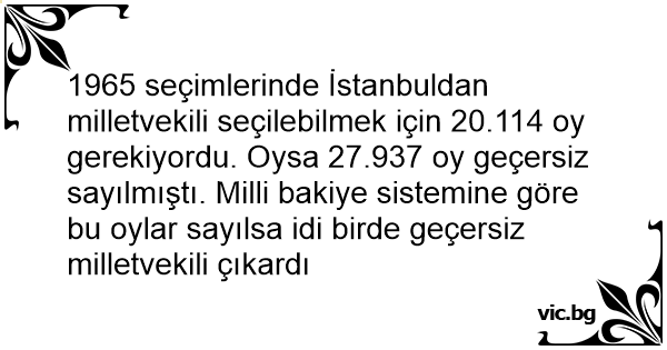 1965 seçimlerinde İstanbuldan milletvekili seçilebilmek için 20.114 oy gerekiyordu. Oysa 27.937 oy geçersiz sayılmıştı. Milli bakiye sistemine göre bu oylar sayılsa idi birde geçersiz milletvekili çıkardı
