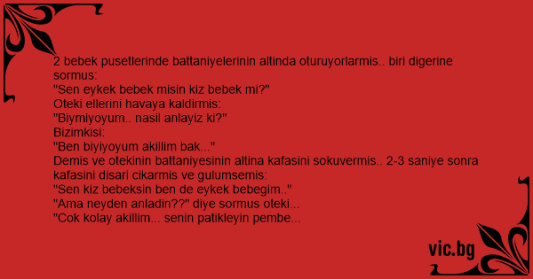 2 bebek pusetlerinde battaniyelerinin altinda oturuyorlarmis.. biri digerine sormus: