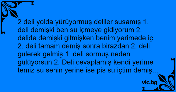 2 deli yolda yürüyormuş deliler susamış 1. deli demişki ben su içmeye gidiyorum 2. delide demişki gitmişken benim yerimede iç 2. deli tamam demiş sonra birazdan 2. deli gülerek gelmiş 1. deli sormuş neden gülüyorsun 2. Deli cevaplamış kendi yerime temiz su senin yerine ise pis su içtim demiş...