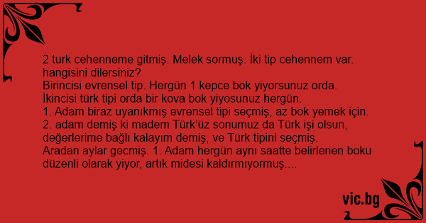 Aradan aylar gecmiş. 1. Adam hergün aynı saatte belirlenen boku düzenli olarak yiyor, artık midesi kaldırmıyormuş. Birgün öbür Türk’ü görüyor kendi cehenneminde, keyfı yerinde. Hayırdır? diyor, pek mutlusun. Ben hergün bir kepçe yemekten öldüm bittim. Sizde işler nasıl diyor.
