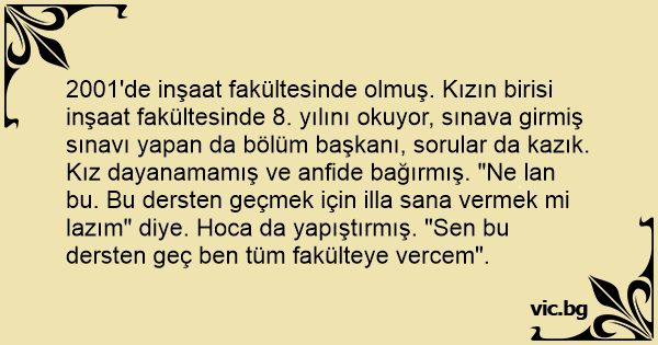 2001'de inşaat fakültesinde olmuş. Kızın birisi inşaat fakültesinde 8. yılını okuyor, sınava girmiş sınavı yapan da bölüm başkanı, sorular da kazık. Kız dayanamamış ve anfide bağırmış. "Ne lan bu. Bu dersten geçmek için illa sana vermek mi lazım" diye. Hoca da yapıştırmış. "Sen bu dersten geç ben tüm fakülteye vercem".