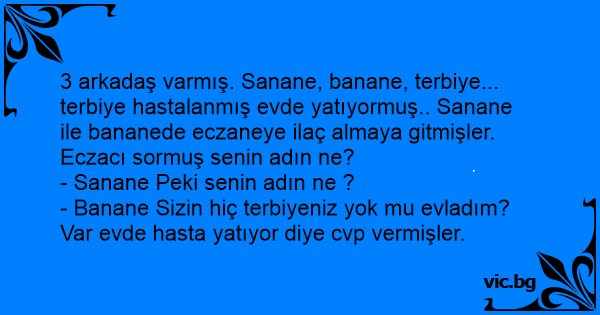 3 arkadaş varmış. Sanane, banane, terbiye... terbiye hastalanmış evde yatıyormuş.. Sanane ile bananede eczaneye ilaç almaya gitmişler.