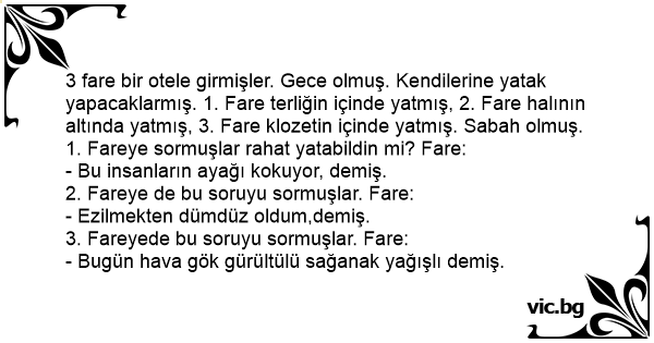 3 fare bir otele girmişler. Gece olmuş. Kendilerine yatak yapacaklarmış. 1. Fare terliğin içinde yatmış, 2. Fare halının altında yatmış, 3. Fare klozetin içinde yatmış. Sabah olmuş.