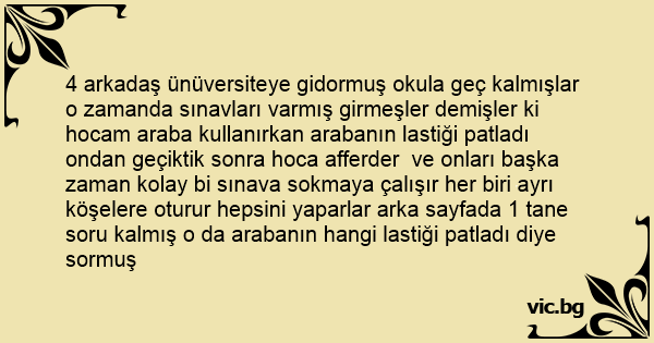 4 arkadaş ünüversiteye gidormuş okula geç kalmışlar o zamanda sınavları varmış girmeşler demişler ki hocam araba kullanırkan arabanın lastiği patladı ondan geçiktik sonra hoca afferder ve onları başka zaman kolay bi sınava sokmaya çalışır her biri ayrı köşelere oturur hepsini yaparlar arka sayfada 1 tane soru kalmış o da arabanın hangi lastiği patladı diye sormuş