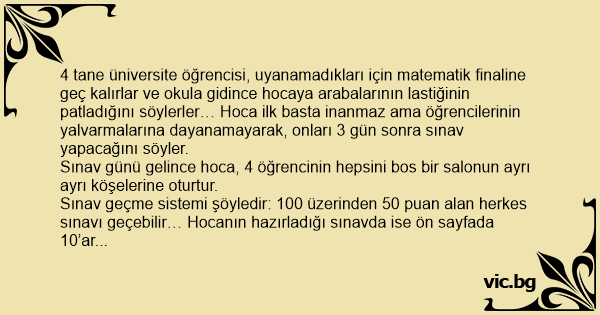Sınav geçme sistemi şöyledir: 100 üzerinden 50 puan alan herkes sınavı geçebilir… Hocanın hazırladığı sınavda ise ön sayfada 10’ar puanlık 4 tane basit matematik sorusu vardır… Bunları kolayca çözerler.