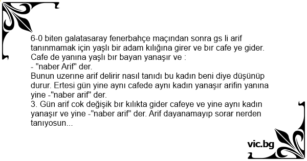 6-0 biten galatasaray fenerbahçe maçından sonra gs li arif tanınmamak için yaşlı bir adam kılığına girer ve bır cafe ye gider. Cafe de yanına yaşlı bır bayan yanaşır ve :