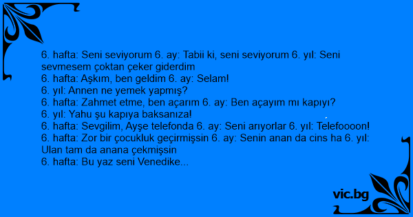 6. hafta: Seni seviyorum 6. ay: Tabii ki, seni seviyorum 6. yıl: Seni sevmesem çoktan çeker giderdim