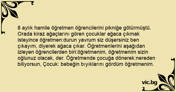 8 aylık hamile öğretmen öğrencilerini pikniğe götürmüştü. Orada kiraz ağaçlarını gören çocuklar ağaca çıkmak isteyince öğretmen:durun yavrum siz düşersiniz ben çıkayım, diyerek ağaca çıkar. Öğretmenlerini aşağıdan izleyen öğrencilerden biri:öğretmenim, öğretmenim sizin oğlunuz olacak, der. Öğretmende çocuğa dönerek:nereden biliyorsun, Çocuk: bebeğin bıyıklarını gördüm öğretmenim.