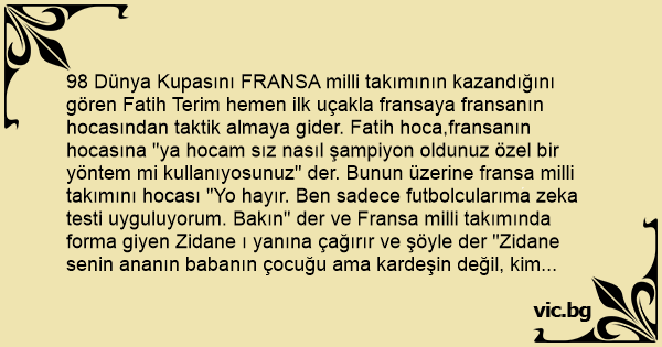 98 Dünya Kupasını FRANSA milli takımının kazandığını gören Fatih Terim hemen ilk uçakla fransaya fransanın hocasından taktik almaya gider. Fatih hoca,fransanın hocasına "ya hocam sız nasıl şampiyon oldunuz özel bir yöntem mi kullanıyosunuz" der. Bunun üzerine fransa milli takımını hocası "Yo hayır. Ben sadece futbolcularıma zeka testi uyguluyorum. Bakın" der ve Fransa milli takımında forma giyen Zidane ı yanına çağırır ve şöyle der "Zidane senin ananın babanın çocuğu ama kardeşin değil, kim bu?" der.