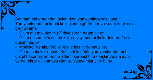 - "Oooo mokoko" demiş. Kabiledeki bütün yamyamlar adamı bir güzel becermişler. Sonra adamı serbest bırakmışlar. Adam aynı yerde tekrar avlanmaya çıkmış. Yamyamlar yine bunu yakalamışlar. Kabileye götürmüşler. Reis gelmiş yine buna: