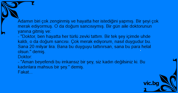 Adamın biri çok zenginmiş ve hayatta her istediğini yapmış. Bir şeyi çok merak ediyormuş. O da doğum sancısıymış. Bir gün aile doktorunun yanına gitmiş ve:
