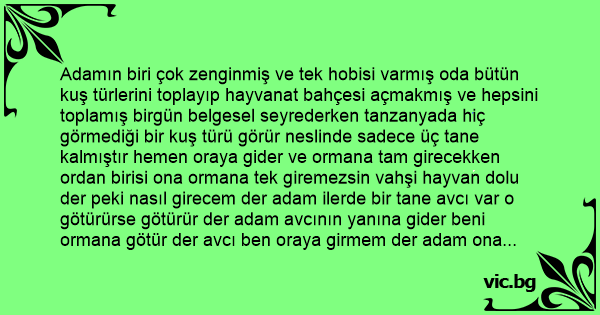 Adamın biri çok zenginmiş ve tek hobisi varmış oda bütün kuş türlerini toplayıp hayvanat bahçesi açmakmış ve hepsini toplamış birgün belgesel seyrederken tanzanyada hiç görmediği bir kuş türü görür neslinde sadece üç tane kalmıştır hemen oraya gider ve ormana tam girecekken ordan birisi ona ormana tek giremezsin vahşi hayvan dolu der peki nasıl girecem der adam ilerde bir tane avcı var o götürürse götürür der adam avcının yanına gider beni ormana götür der avcı ben oraya girmem der adam ona sana istemediğin kadar para verecem der avcı düşünür tamam der ormana girerler üç kuşu görürler üçüde bir ağaçtadır avcı tüfeğine uyuşturucu kurşun koyar kuşa eteş eder kuş yere düşer köpek avı almaya gider ama köpek hangi av olursa olsun sikmeden getirmez kuşu siker getirir avcı ikinci kuşu vurur köpek hemen koşar onuda siker getirir avcı üçüncü son kuşa nişan alır ama ağaçların dallarından bir türlü vuramaz avcı adama tüfeği verir şöyle der ben ağaca çıkacam dalı kaldıracam sende kuş düşerse vuracaksın ben düşersem hemen köpeği vuracaksın