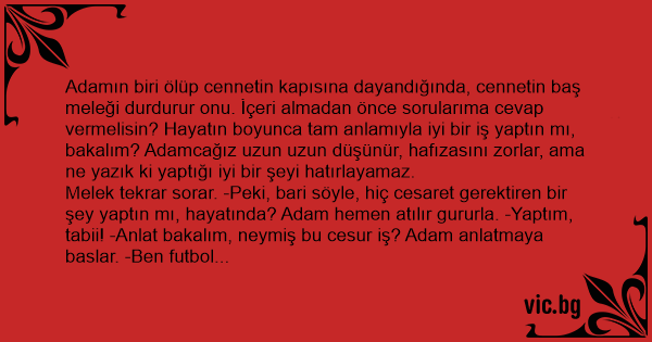 Melek tekrar sorar. -Peki, bari söyle, hiç cesaret gerektiren bir şey yaptın mı, hayatında? Adam hemen atılır gururla. -Yaptım, tabii! -Anlat bakalım, neymiş bu cesur iş? Adam anlatmaya baslar. -Ben futbol hakemiydim. Kadıköy’de bir Fenerbahçe-Galatasaray maçını yönetiyordum. Maçın son dakikasında Fenerbahçe aleyhine penaltı çaldım. -Vay canına, gerçekten cesurmuşsun sen,hadi geç bakalım! Cennetin kapıları açılır.