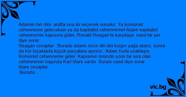 Adamın biri ölür, arafta ona iki seçenek sunulur: Ya komünist cehenneme gideceksin ya da kapitalist cehenneme! Adam kapitalist cehennemin kapısına gider, Ronald Reagan’la karşılaşır, nasıl bir yer diye sorar.