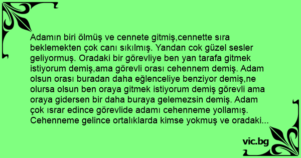Adamın biri ölmüş ve cennete gitmiş,cennette sıra beklemekten çok canı sıkılmış. Yandan сок güzel sesler geliyormuş. Oradaki bir görevliye ben yan tarafa gitmek istiyorum demiş,ama görevli orası cehennem demiş. Adam olsun orası buradan daha eğlenceliye benziyor demiş,ne olursa olsun ben oraya gitmek istiyorum demiş görevli ama oraya gidersen bir daha buraya gelemezsin demiş. Adam çok ısrar edince görevlide adamı cehenneme yollamış. Cehenneme gelince ortalıklarda kimse yokmuş ve oradaki görevliye sormuş demin buradan çok eğlenceli sesler geliyordu nerede bunler demiş. Görevlide 'hayır efendim demin duyduklarınız cehennemin reklamlarıydı'demiş.(YANİ ADAM CEHENNEME GİTMİŞ