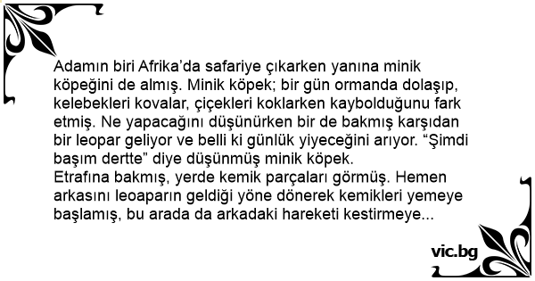 Adamın biri Afrika’da safariye çıkarken yanına minik köpeğini de almış. Minik köpek; bir gün ormanda dolaşıp, kelebekleri kovalar, çiçekleri koklarken kaybolduğunu fark etmiş. Ne yapacağını düşünürken bir de bakmış karşıdan bir leopar geliyor ve belli ki günlük yiyeceğini arıyor. “Şimdi başım dertte” diye düşünmüş minik köpek.