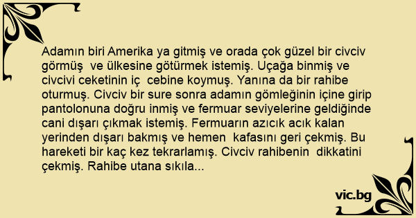 Adamın biri Amerika ya gitmiş ve orada çok güzel bir civciv görmüş ve ülkesine götürmek istemiş. Uçağa binmiş ve civcivi ceketinin iç cebine koymuş. Yanına da bir rahibe oturmuş. Civciv bir sure sonra adamın gömleğinin içine girip pantolonuna doğru inmiş ve fermuar seviyelerine geldiğinde cani dışarı çıkmak istemiş. Fermuarın azıcık acık kalan yerinden dışarı bakmış ve hemen kafasını geri çekmiş. Bu hareketi bir kaç kez tekrarlamış. Civciv rahibenin dikkatini çekmiş. Rahibe utana sıkıla adama donmuş: