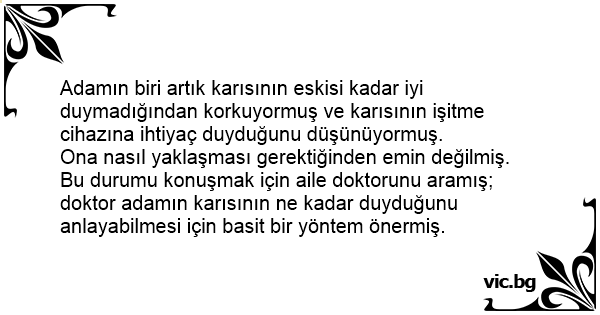 Ona nasıl yaklaşması gerektiğinden emin değilmiş. Bu durumu konuşmak için aile doktorunu aramış; doktor adamın karısının ne kadar duyduğunu anlayabilmesi için basit bir yöntem önermiş.