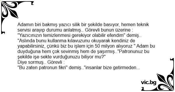 "Yazıcınızın temizlenmesi gerekiyor olabilir efendim" demiş.. "Aslında bunu kullanma kılavuzunu okuyarak kendiniz de yapabilirsiniz, çünkü biz bu işlem için 50 milyon alıyoruz " Adam bu duyduğuna hem çok sevinmiş hem de şaşırmış.."Patronunuz bu şekilde işe sekte vurduğunuzu biliyor mu?"